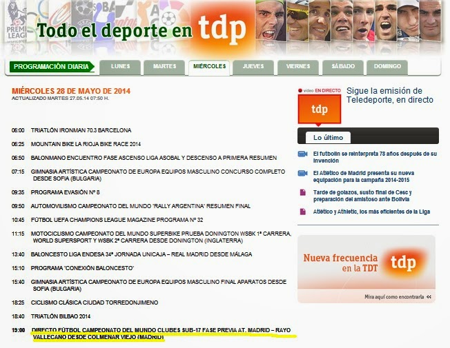 El partido será a las siete de la tarde en este canal temático, y enfrentara a los equipos sub-17 del Atlético de Madrid y del Rayo Vallecano y se emite en directo, englobado en el campeonato mundial de clubes de esta categoría.