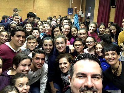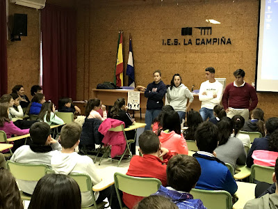 Esta mañana el mismo alumnado de 1º de ESO ha recibido una estupenda charla sobre el fomento del deporte a cargo de cuatro jóvenes de la localidad: Inma, futbolista; Miguel Ángel, futbolista; Marta, jugadora de rugby; y Luis Manuel, jinete de doma vaquera. Los dos últimos terminaron sus estudios en nuestro centro y Miguel Ángel es uno de nuestros actuales alumnos de 1º de Bachillerato.