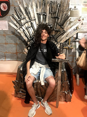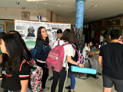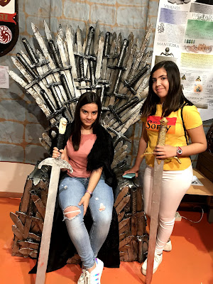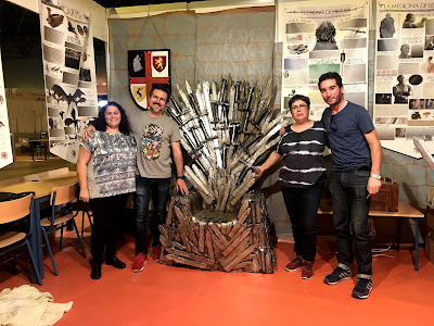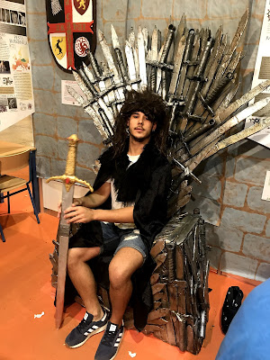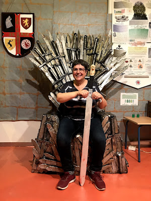 El Trono de hierro de Juego de tronos es uno de los elementos más llamativos y característicos de la serie, y son muchos los fans que en cualquier evento buscan una réplica de éste para sentarse en él y hacerse una foto. Nuestro presupuesto en nuestro centro, público, nada tiene que ver con el de los centros privados y concertados, muchos de los cuales pudimos ver en la Feria de la ciencia, puesto que colindaban con nuestro stand, pero no por ello íbamos a renunciar a contar con nuestro propio Trono de hierro, aunque fuera en una versión más casera. Y para ello desde primera hora tuve la suerte de contar con mi compañero y amigo José Manuel Camacho, profesor de Tecnología de nuestro centro, un profesional como la copa de un pino, pero sobre todo una gran persona, siempre dispuesto a colaborar y a ayudar a todo el mundo en casi cualquier proyecta que empredamos en el IES La Campiña. A principios de curso hablé con José Manuel y le planteé la idea, y él, que no es seguidor de la serie Juego de tronos, comenzó a informarse y a empaparse de todo lo necesario para realizar una réplica del Trono con material reciclado. Llegado el momento y tras la planificación de la elaboración con su alumnado de 1º de ESO de Tecnología, nos fuimos los dos a comprar un sillón de plástico para transformarlo en el sillón más codiciado de Poniente. Y tras un trabajo minucioso con un grupo de alumnos muy motivados consiguió terminar una réplica de cartón (cajas que nos cedían algunos comercios y embalajes de los tubos led con los que renovamos la iluminación del centro hace unos años) del Trono de hierro mas que digna, que ha causado sensación en la Feria. El remate al acabado del Trono, se le dio en el taller de Carrocería del Ciclo Formativo de Grado Medio que impartimos en nuestro instituto, donde el compañero Jose María López y uno de sus alumnos, José Manuel, además de la ayuda de otros compañeros como Javier Valverde, José Miguel Rangel y Miguel Duarte, le dieron las capas de pintura y fijación pertinentes. Pero el acabado final para que quedará mucho más realista y más parecido al de la serie Juego de tronos se lo dio nuestra compañera del departamento de Plástica Maribel Wanceulen, que lo dejó prácticamente idéntico. Vaya desde aquí mi agradecimiento a todos ellos.