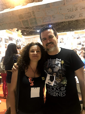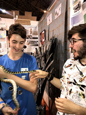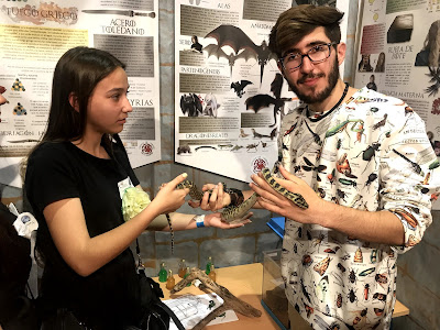 Una de las visitas más esperadas del día fue la de Carlos, biólogo en ciernes, que ya el año pasado estuvo conmigo en el stand, y que este año nos trajo varias crías de dragón, o lo que es lo mismo lagartos; mantícoras, o más bien dicho mantis, e incluso una pitón. Carlos es una persona sorprendente, un apasionado de la divulgación y del mundo animal, y su colaboración este año ha sido breve, pero muy interesante. Muchos curiosos apartaron su atención del llamativo Trono de hierro para acercarse a que Carlos les mostrara y explicara sus animales. No puedo dejar de mencionar aquí a mis compañeros Cristina López y José Manuel Camacho que fueron los que me acompañaron durante todo el día. ¡Muchas gracias compañeros!