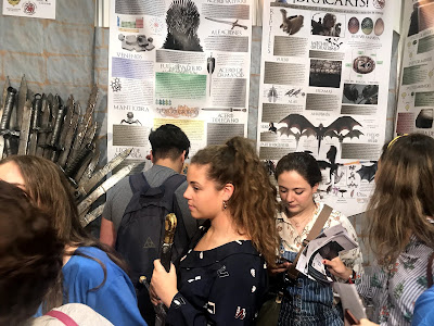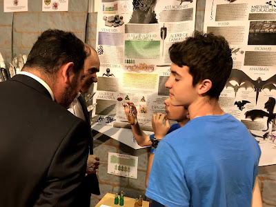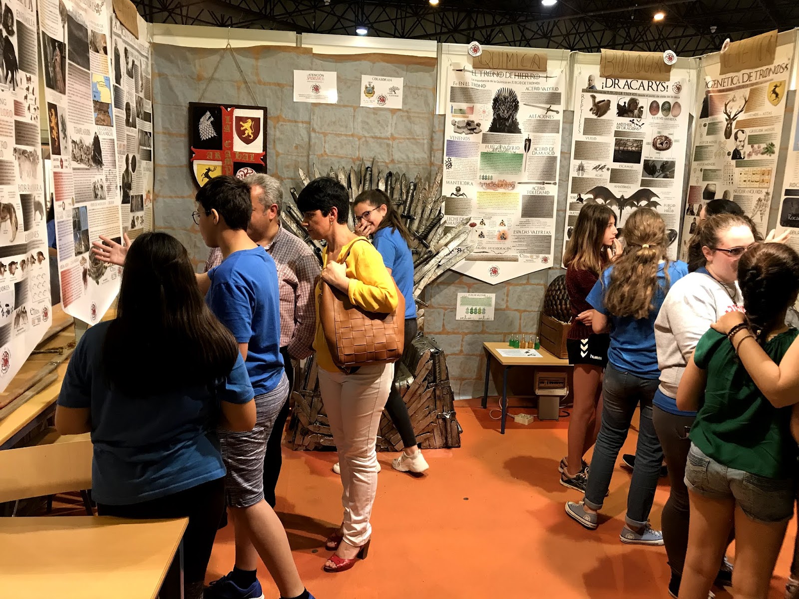Como bien decía la gente empezó a llegar poco a poco, pero conforme iban pasando se acumulaban en nuestro stand. El Trono de hierro no dejaba indiferente a nadie y todos querían una foto en él. Muchos se asombraban de que ademas fuera perfectamente funcional y te pudieras sentar con total seguridad, pero a todos les encantaba sentados o de pie a su lado. El hecho de que lleváramos una capa de la Guardia de la noche y las espadas valyrias todavía le daba más valor a las fotos. Aprovechando ese éxito, mis alumnos estaban preparados para abordar a la gente que estaba esperando para la foto y aprovechar para explicarles los carteles o cualquier otra parte del proyecto, de manera que conseguimos evitar que se formaran colas, teniendo el stand siempre lleno y a los chicos repartidos en la realización de diferentes tareas. El día entero fue de un ritmo muy intenso en el que los chicos de 2º de Bachillerato se llevaron el peso de las explicaciones, mientras los de 1º de ESO se pegaban a ellos para aprender como explicarlos de la mejor manera, y realizaban sus propias explicaciones de la elaboración de los materiales, así como realizaban tareas de llamar a las personas que pasaban por allí a que entraran en nuestro stand. Fue una tarea altamente coordinada que hizo que durante todo el día los chicos respetaran sus turnos, teniendo tiempo para «trabajar» en nuestro proyecto y ver el resto de propuestas de la Feria de la Ciencia. Me acompañaban ese día en la labor de vigilancia y coordinación mis compañeros Maribel Flores y José Manuel Caparrós que estaban encantados viendo lo bien que marchaba todo.