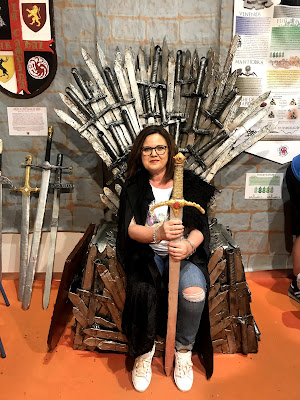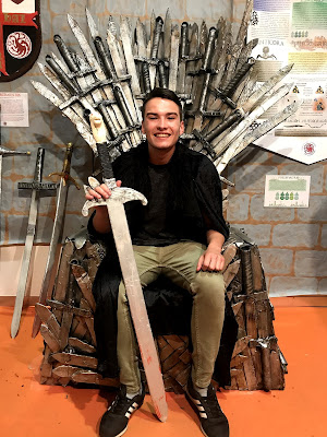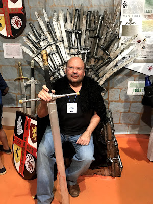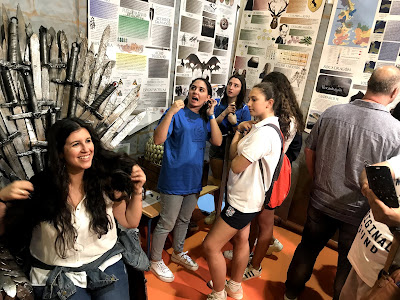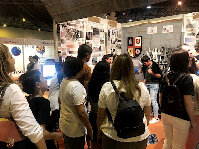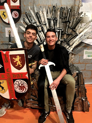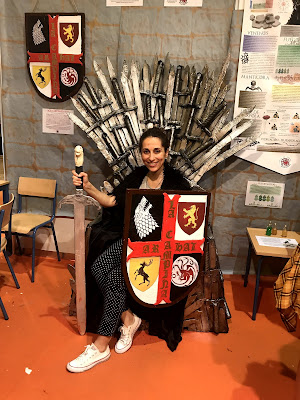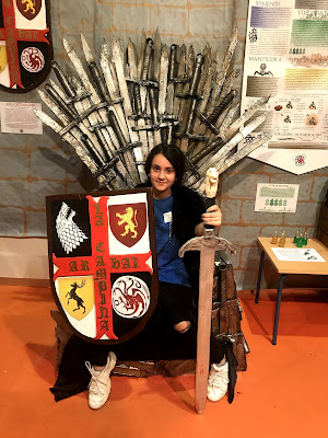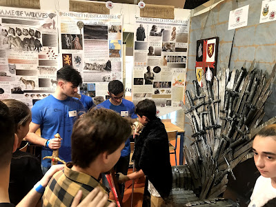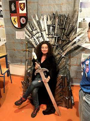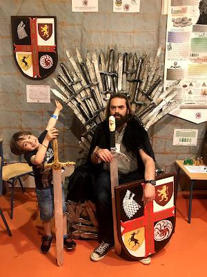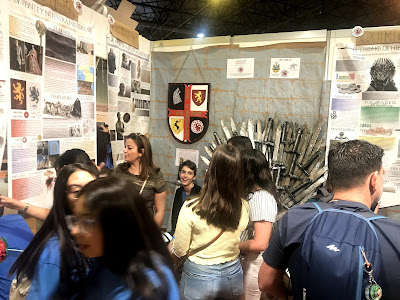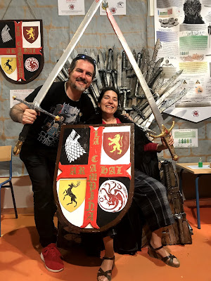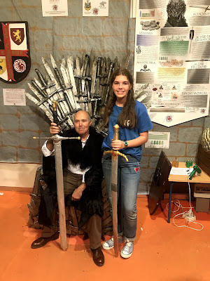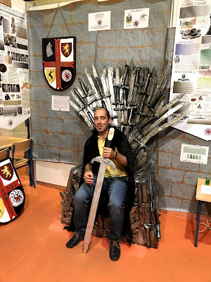 Pero no queda ahí la cosa y el resto de los elementos del stand número 41 se lo debemos a mi amiga y compañera Cristina López, también profesora del departamento de Plástica, que con su alumnado de 4º de ESO fue la encargada de elaborar las réplicas de cuatro de las espadas de acero valyrio de Juego de tronos: Garra, Guardajuramentos, Hielo y Veneno de Corazón. También fueron ellos quienes hicieron todo el atrezzo de cartón y papel continuo para simular que nuestro stand era una fortaleza medieval, así como dos escudos con los emblemas de las cuatro casas principales de Juego de tronos y el rótulo de nuestro centro. El resultado tras el montaje fue espectacular y las fotos en el trono de hierro con el entorno simulando piedra, los escudos y las espadas han maravillado a la gente que pasó por allí. Muchas gracias también a Cristina y a sus chicos por este enorme trabajo.