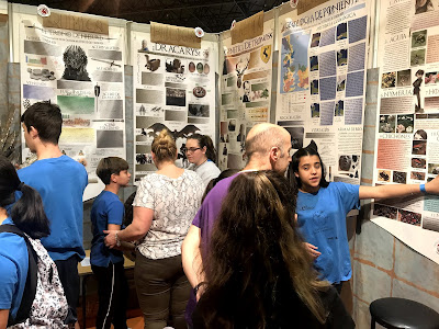 Y al final de la tarde llegó la visita que más ilusión me hizo ese día, la de mi mujer, Macarena y mis hijas, Irene y Marta, acompañadas por mi sobrina María, que repetía en la feria tras haber venido el día anterior con sus compañeros de instituto. Nos hicimos las pertinentes fotos en el Trono y con los huevos de dragón y varios de mis alumnos les explicaron los carteles, tras lo cual se dispusieron a dar una vuelta por el resto de la Feria de la Ciencia. Hasta nervioso estaba yo por estar a la altura durante la visita de tan importantes personalidades (para mí, claro).