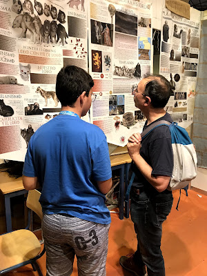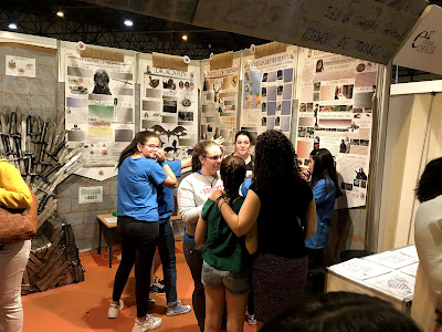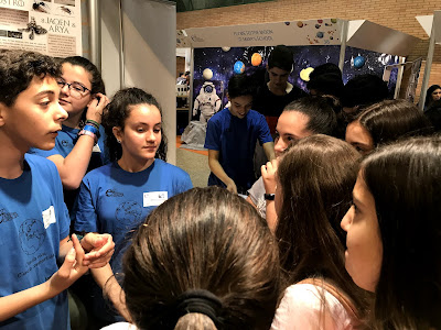 El único problema que tuvimos ese día es que nos faltaron 9 pulseras, pienso que de nuevo por un fallo de la organización, porque yo había enviado el número exacto de alumnos que llevaría y tras repartir las pulseras me faltaron esas. Tuve que acudir al control de acceso varias veces, puesto que algunos de los encargados de la entrada eran más estrictos que otros, y a pesar de haberlo comunicado a secretaría, de que habían tomado nota de la incidencia y de que llevaban las pegatinas de divulgadores, no había manera de que los dejaran pasar. He de decir, que quitando estos fallos, la organización de la Feria lo ha hecho espectacularmente bien, y durante estos dos primeros días recibí la visita de la directora de la Feria, así como de algunos miembros de la secretaría y del equipo de atención a los encargados de los proyectos, que me pidieron disculpas por los errores de las camisetas del primer día. También pasaron por el stand a disculparse los representantes de la tienda Biobee, que nos regalaron 8 camisetas más y se comprometieron a hacernos un descuento en futuras ediciones. Su gesto les honra y desde aquí les damos las gracias a todos ellos.