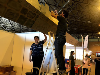 Miércoles 15 de mayo. El miércoles fue el día que teníamos previsto el montaje, así que por la mañana preparamos todos los materiales para después por la tarde poder llevarlos y dejar casi todo preparado para abrir el jueves. Para el transporte de las partes de cartón que simulaban el castillo y sobre todo para el Trono de hierro, contamos con la colaboración del Excelentísimo Ayuntamiento de la localidad. Tras varias conversaciones con nuestro alcalde Miguel Ángel Márquez, conseguimos que nos facilitara una furgoneta para llevar a cabo este transporte, así que a través del concejal de urbanismo, Javier Avecilla, el mismo miércoles teníamos la furgoneta en el parking del instituto con todos los materiales cargados y dispuestos para ser transportados los 45 km que nos separan de la capital. A las 5:30 de la tarde, José Manuel Camacho, Cristina López y nuestra compañera de Francés, Marisa Rodríguez, así como nuestro director Rafael Vergara, que también estuvo un rato, partimos para el Palacio de Congresos para empezar el montaje de nuestro stand. La nevera de Marisa además me vino de lujo no solo en aquel momento, sino en los días posteriores, porque así podíamos tener agua fresca durante los turnos de atención al público. Mucho calor, mucho sudor, risas, compañerismo y la satisfacción de ver la culminación del trabajo bien hecho, nos llevaron hasta las 9:30 aproximadamente cuando dimos por terminado el montaje. A falta de algunos detalles que terminaríamos a la mañana siguiente nos volvimos hacia Arahal mas que satisfechos. De nuevo mi agradecimiento a todos ellos por haber hecho posible esto.