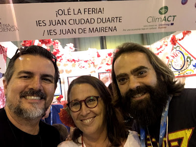 Por la tarde pude escaparme un ratito para visitar el stand de mi amigo Israel García, con sus alumnos del IES Torreblanca que me explicaron magistralmente varios trucos con espejos. Los chicos de Israel, alumnos en muchos casos en riesgo de exclusión social, hicieron una labor de divulgación elegante, certera, y con una educación y saber estar que muchos de otros centros supuestamente mejores quisieran. Y no miento cuando digo que me emocioné al conocer las historias de inmigración que había tras algunos de aquellos chicos. Tras felicitarlos a ellos y a Israel, me despedí muy orgulloso de conocer a gente tan increíble como este profesor de Matemáticas con el que me crié en la calle Miraflores de nuestro pueblo, Arahal; con el que compartí muchas horas de diversión y estudio en el instituto; y con el que conviví en la residencia de estudiantes mientras estudiábamos nuestras respectivas carreras en Sevilla. ¡Gracias por la gran labor que realizas Isra!
