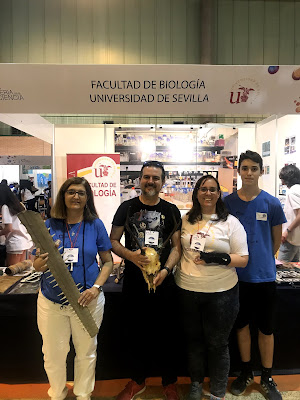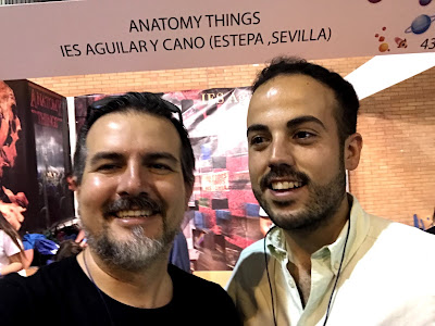 De nuevo la experiencia de ese segundo día fue espectacular y todos los alumnos valoraron muy positivamente todo lo allí vivido. También recibimos visitas «vip«, como fueron las de Lucía y Ana, hijas de mi amiga y compañera Raquel, así como de la propia Raquel y de Antonio, su marido. También los acompañaba Víctor Garzón, un compañero de fatigas, biólogo, al que tuve la suerte de conocer el año pasado, y con el que compartí muy buenos ratos en la Feria de la ciencia anterior. A todos ellos les tengo un cariño y aprecio especial, y me alegró mucho volver a verlos allí. Pasaron ese día también mucha gente de Arahal y Paradas, ya que algunos de los centros de nuestro pueblo llevaron a sus alumnos de visitas y los compañeros de Paradas habían montado su propio stand. El IES Europa de Arahal llevó a sus alumnos y pude saludar a Juan Francisco, profesor de Geografía e Historia y a mi sobrina María y a sus amigas. También pasó por allí mi compañero Andrés, que dirigía a los alumnos del IES San Albino de Paradas que participaban por primera vez. Me hizo mucha ilusión verlo allí a él y a sus chicos de 4º de ESO, porque muchos de ellos, al año que vienen pasarán a estudiar bachillerato en nuestro centro, y probablemente venga a la Feria de la Ciencia conmigo. Rafael López, director del IES San Albino que estaba echándole una mano a sus compañeros en su stand también vino a visitarnos. También me encontré con José Antonio, compañero biólogo en Estepa que había montado su stand frente al nuestro.