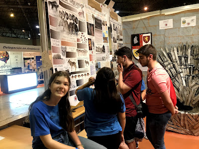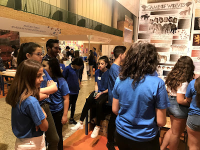 Viernes 17 de mayo. De nuevo tocaba ir a las 8:15, y allí estaba el siguiente turno de alumnos que iba a participar. En este caso les tocaba a los chicos de 4º de ESO de Plástica, de mi compañera Cristina, que habían elaborado los materiales; a los alumnos de 1º de Tecnología, de mi compañero José Manuel, que habían elaborado el trono; y a los alumnos de 3º de ESO de Geografía e Historia, de mi compañero Rafael, que habían elaborado el cartel de Historia. Os podéis preguntar qué pintan alumnos de Geografía e Historia en una Feria de la Ciencia, pero es que creo que la separación entre «letras» y «ciencias» esta ya muy desfasada y estos chicos se habían preparado a conciencia para explicar perfectamente lo su parte, así como todas las demás. Y de hecho lo hicieron perfectamente. Repetían también los alumnos de 2º de ESO que voluntariamente se habían ofrecido a participar en el proyecto. Tengo la premisa y lo repito muchas veces, que a aquellos alumnos que quieran implicarse y trabajar no hay que quitarles las ganas, y eso mismo pensé cuando incluí en el proyecto a Daniela, Marta, Lucía, Rafa y Cristina. Su labor ha sido fundamental en que todo salga a la perfección. ¡Mi agradecimiento también a estos chicos!